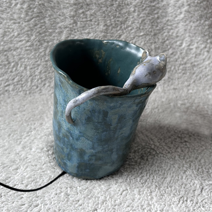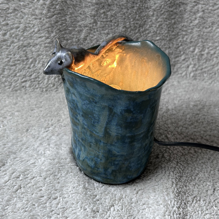 Unieke lamp keramiek met muis (code LK003). 14 cm hoog, doorsnede circa 11 cm. Prijs inclusief verzending: € 37,=